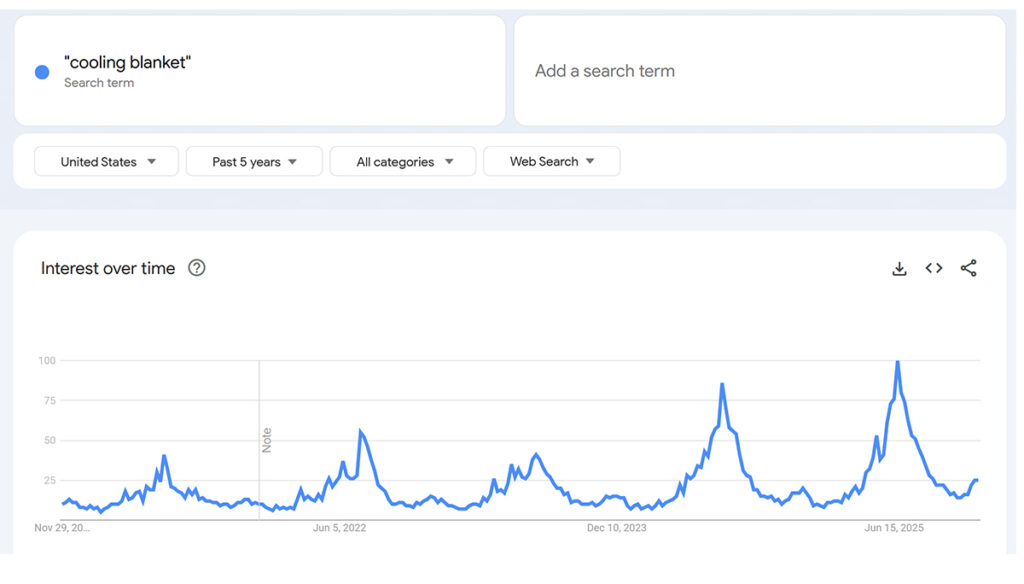 “Cooling blanket” has seen rising search interest (from Google Trends) in recent years, establishing it as a popular seasonal item. With ongoing global temperature increases, demand for products that provide a cooling sensation is expected to continue its growth trend.